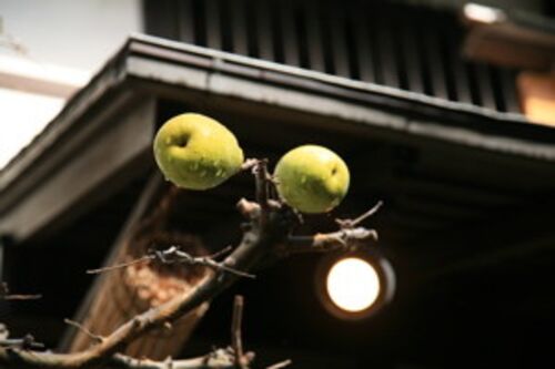 見 三千院の門前に映えていた花梨の木。雨露に濡れてきれい。
