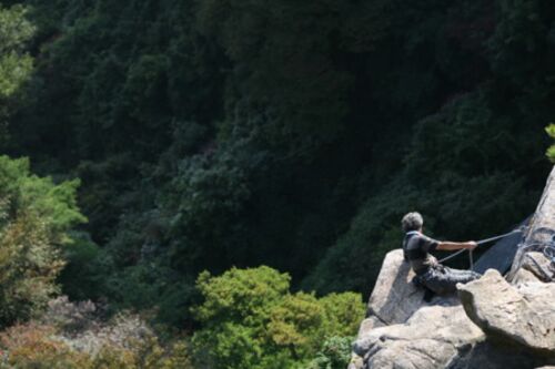 中央稜下部の終了点でビレーするクライマー。 日曜の六甲登山は堡塁岩まで歩いて往復。岩場では多くのクライマーが楽しんでいた。この岩場は尾根の上にあって谷底を見下ろすのでスケールの割に高度感があり壮快。いつ来ても気持ちがよい。 これはその脇のフ…